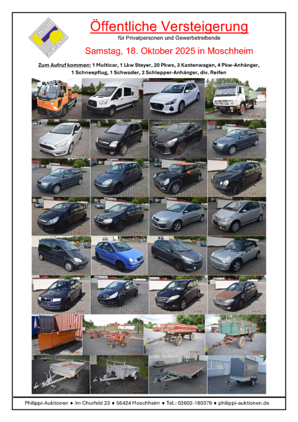 vorläufiger Versteigerungskatalog für unsere Auktion am 18.10.2025 Hier können Sie den vorläufigen Versteigerungskatalog mit Fotos und Ausrufpreisen für unsere Auktion am 18.10.2025 herunter laden vorläufiger Versteigerungskatalog - 2025[...] PDF-Dokument [5.7 MB]